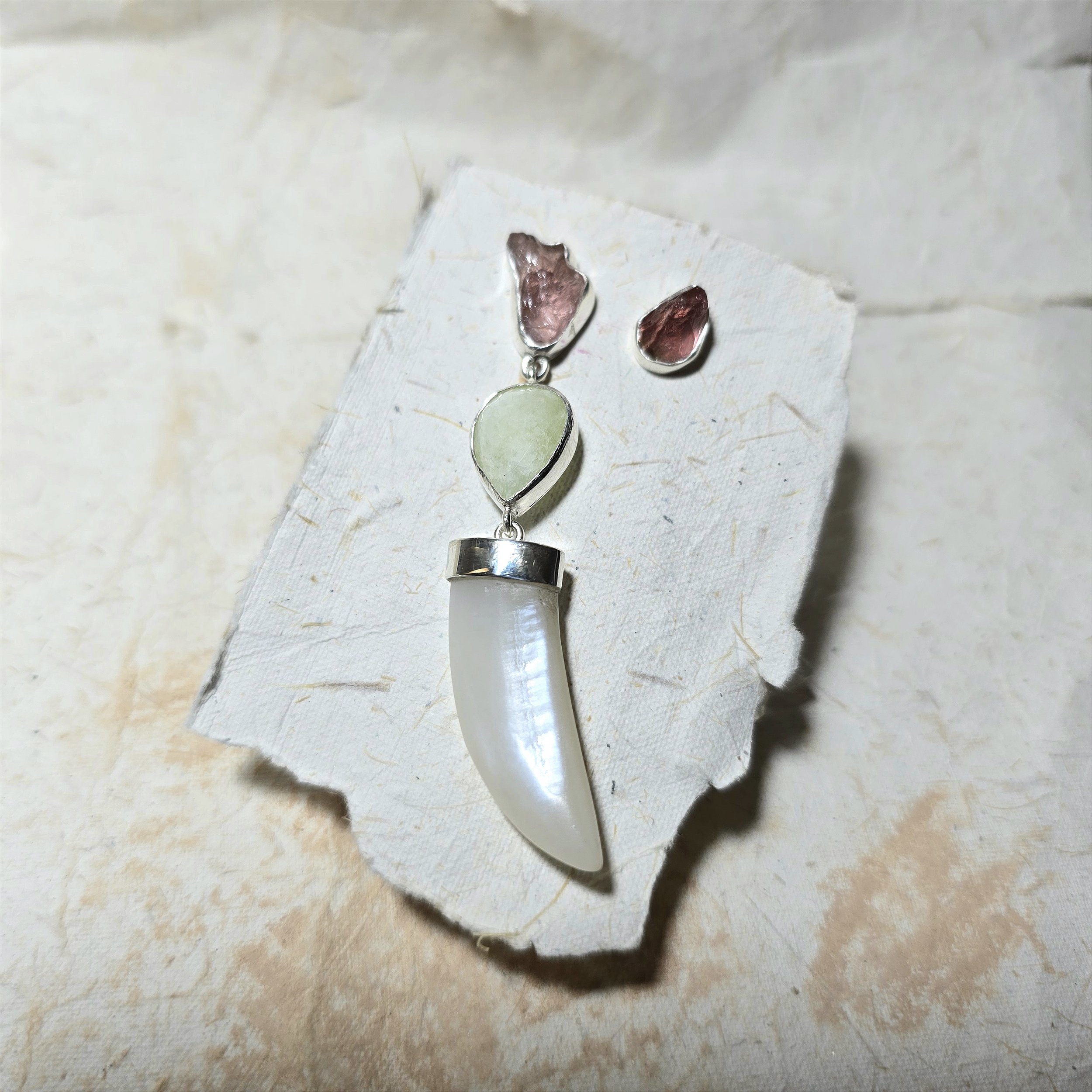 O brinco é confeccionado artesanalmente em prata e possui pedras naturais turmalina rosa, madrepérola e água-marinha, que conferem cores suaves e delicadas ao acessório. O acabamento detalhado e a combinação dos materiais fazem esse brinco uma peça sofisticada e elegante para diversas ocasiões.