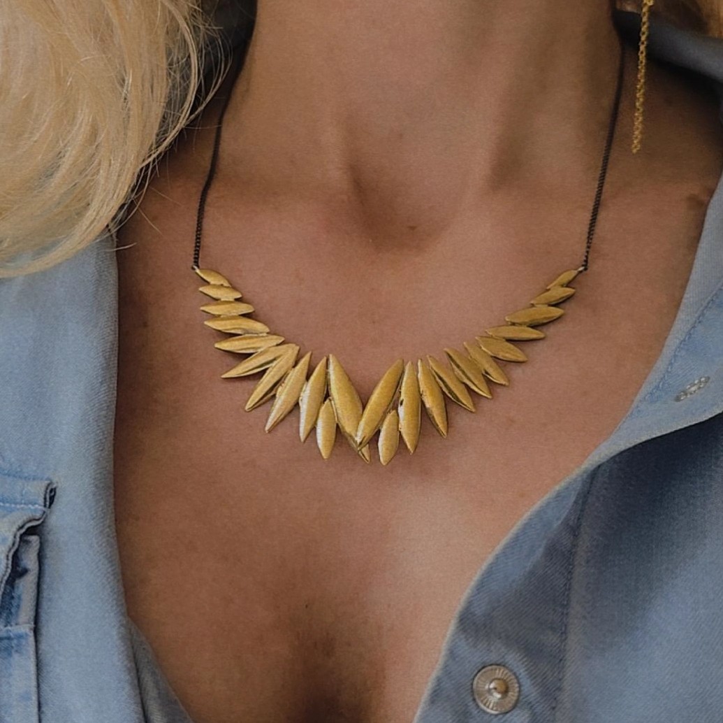 Esse colar é feito com prata 950 oxidada, que oferece resistência e um acabamento escurecido elegante, acompanhado por detalhes em latão que dão um toque de brilho e modernidade. A corrente fina realça o design das peças em formato pontiagudo.