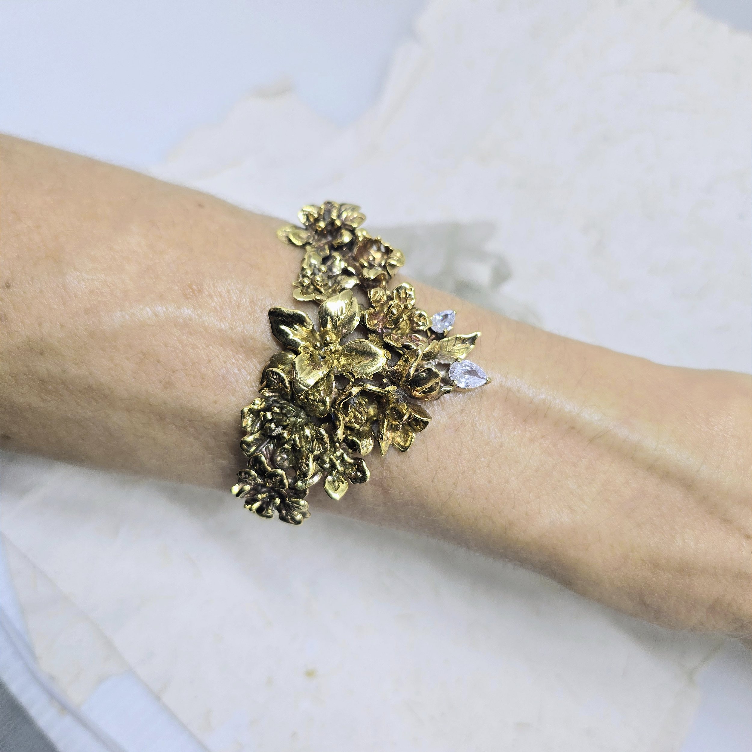 A Pulseira Blooming é feita em latão com cravação de zirconia cristal.Esta pulseira foi esculpida a mão em cera e depois transformada em metal .Uma obra de arte que traz uma composição única de flores, ideal para quem busca um acessório elegante e cheio de estilo.